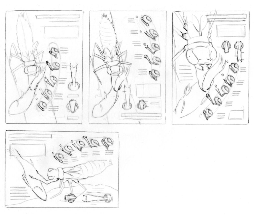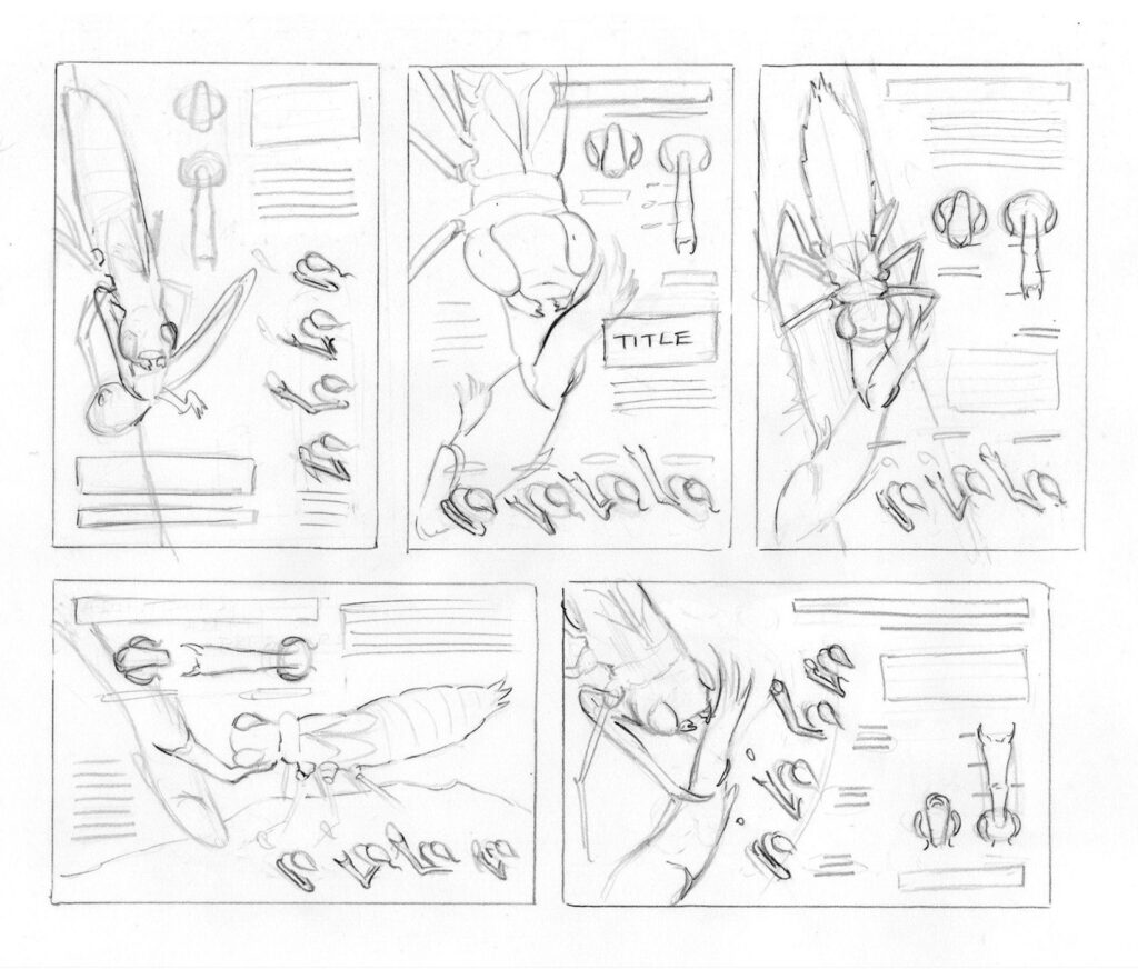 Several thumbnail sketches were created to test composition, explore ideas, plan how information will be communicated, and guide the development of the final illustration.