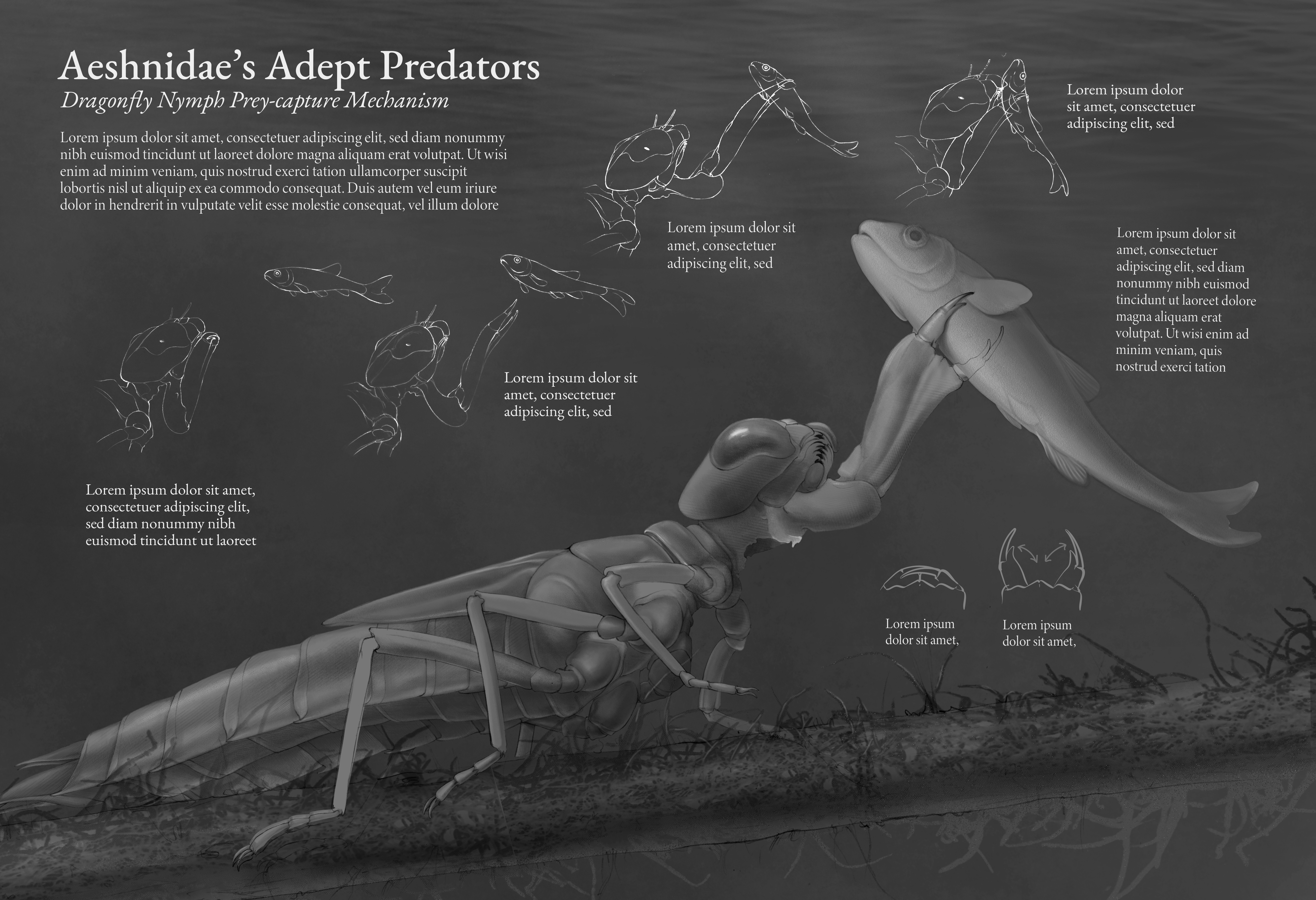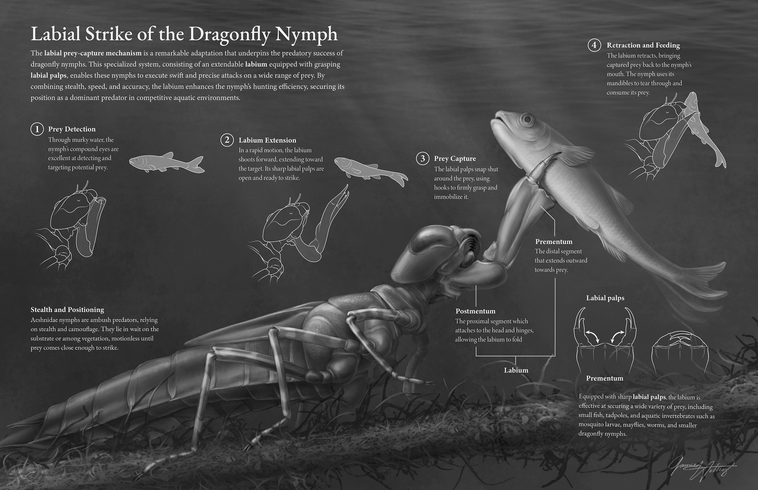 This greyscale tonal illustration examines the specialized prey-capture mechanism of dragonfly nymphs (Aeshnidae), which underpins their success as freshwater predators. At the core of this adaptation is the extendable labium, equipped with grasping labial palps that enable these nymphs to execute swift and precise attacks on a wide range of prey. The piece depicts each stage of the strike sequence: detection with compound eyes, labium extension, prey capture, and retraction, illustrating how dragonfly nymphs are so adept at ambushing prey such as tadpoles, small fish, and aquatic invertebrates.
