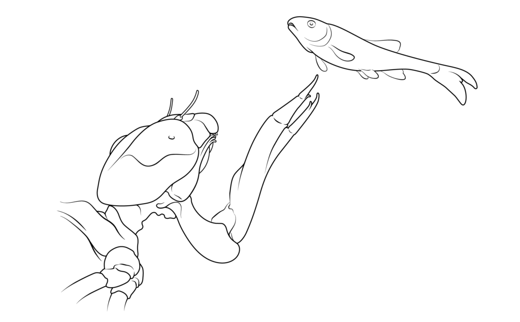Equipped with sharp labial palps, the labium is effective at securing a wide variety of prey, including small fish, tadpoles, and aquatic invertebrates such as mosquito larvae, mayflies, worms, and smaller dragonfly nymphs.